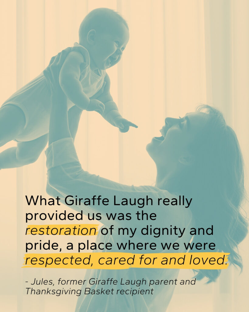 Over the holidays, reality hit hard. With a part-time job and limited income, I knew I couldn’t afford a Thanksgiving meal for my children. Asking for help was one of the hardest things I’ve ever done. I’ll never forget the afternoon I went to pick up a holiday basket from Giraffe Laugh’s pantry, I was embarrassed, overwhelmed, and on the verge of tears.